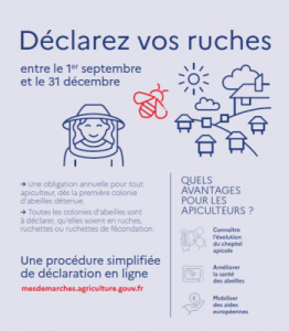 La déclaration de ruches est à réaliser du 1er septembre au 31 décembre en ligne sur le site du Ministère de l’Agriculture : cliquez ici.