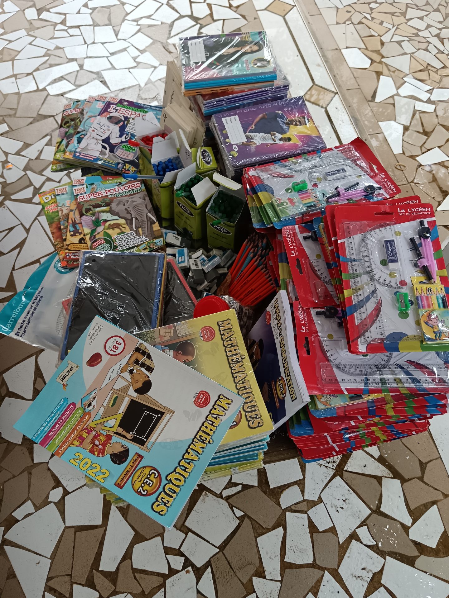 - À l’école du village, située à BAMBILOR CITÉ DABBAH accueillant cette année, dans 3 classes, une soixante d’enfants de Ia maternelle au Cm2 et 3 instituteurs. Chaque élève a pu bénéficier du nécessaire scolaire leur permettant d’étudier dans de bonnes conditions (livre de lecture, de mathématiques, cahier, stylo..).