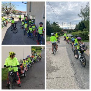 Deux lignes de VELOBUS fonctionnent tous les lundis. Un vélo-charrette transporte les cartables, libérant les enfants d’une charge parfois bien lourde ! Le VELOBUS est un mode de déplacement en commun à vélo, avec des horaires de passage fixes sur un trajet déterminé et encadré par des adultes. Il permet à un groupe d’enfants d’effectuer le trajet de leur domicile à l’école et inversement, en toute sécurité et gratuitement, sans faire appel à la voiture des parents. Des accompagnateurs adultes bénévoles encadrent à vélo, un petit groupe d’enfants jusqu’à l’école, en suivant un itinéraire précis. Comme pour une ligne de bus, les enfants rejoignent des points d’arrêts situés le plus près de leur domicile, en respectant des horaires de passage déterminés. Selon le lieu de résidence des élèves, plusieurs lignes peuvent être créées, afin de permettre aux élèves vivant dans les différentes parties de la commune de bénéficier d’une ligne. Le retour facultatif se fait dans les mêmes conditions.